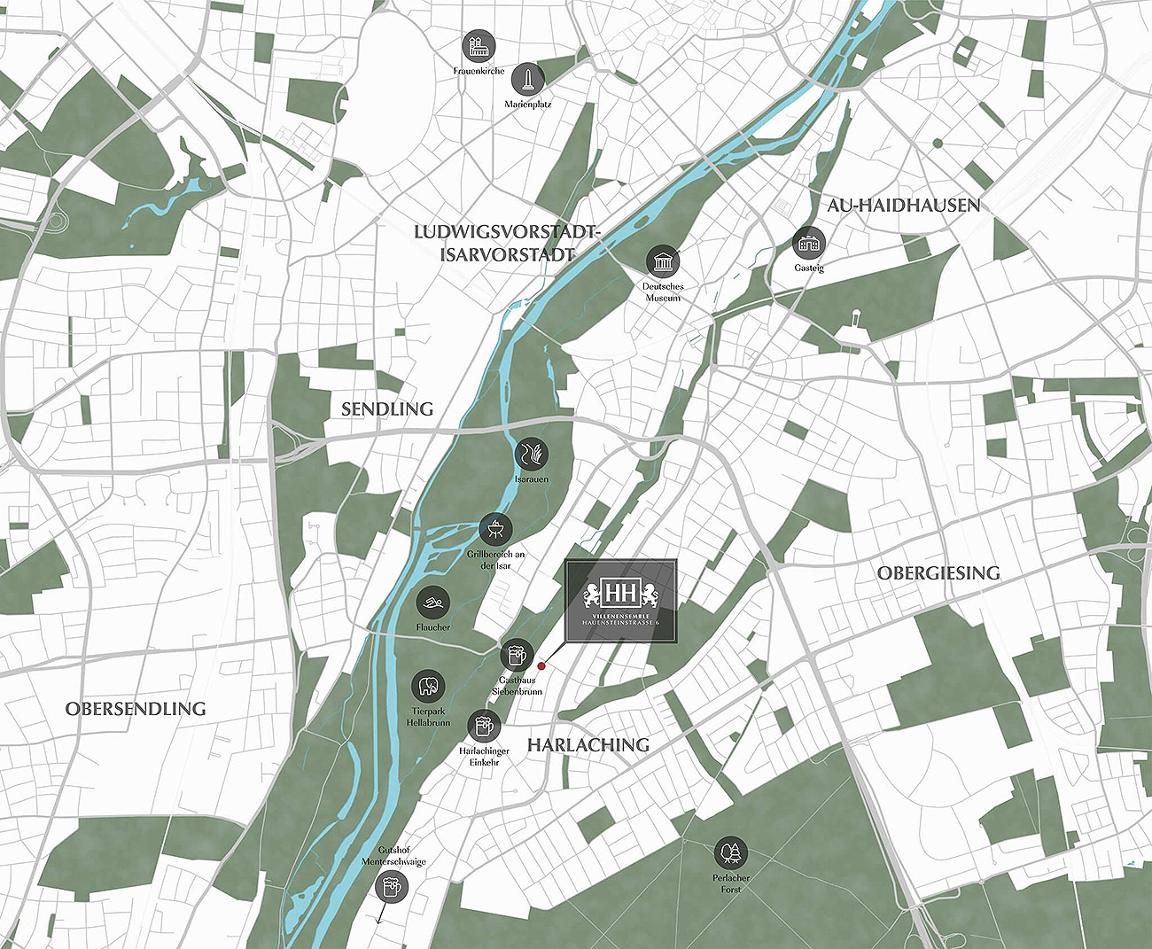 Der äußerst begehrte und beliebte Münchener Stadtteil Harlaching birgt viele Schätze, wie die hübschen Häuser an der Mondstraße und der freigelegte Auer Mühlbach. Diese haben diesem Ortsteil den Beinamen „Münchens Klein-Venedig“ verschafft. Im Villenviertel Harlaching dominieren hingegen inmitten großzügiger Grünanlagen und altem Baumbestand elegante und großbürgerliche Villen im Jugendstil, Historismus sowie moderner Architektur.