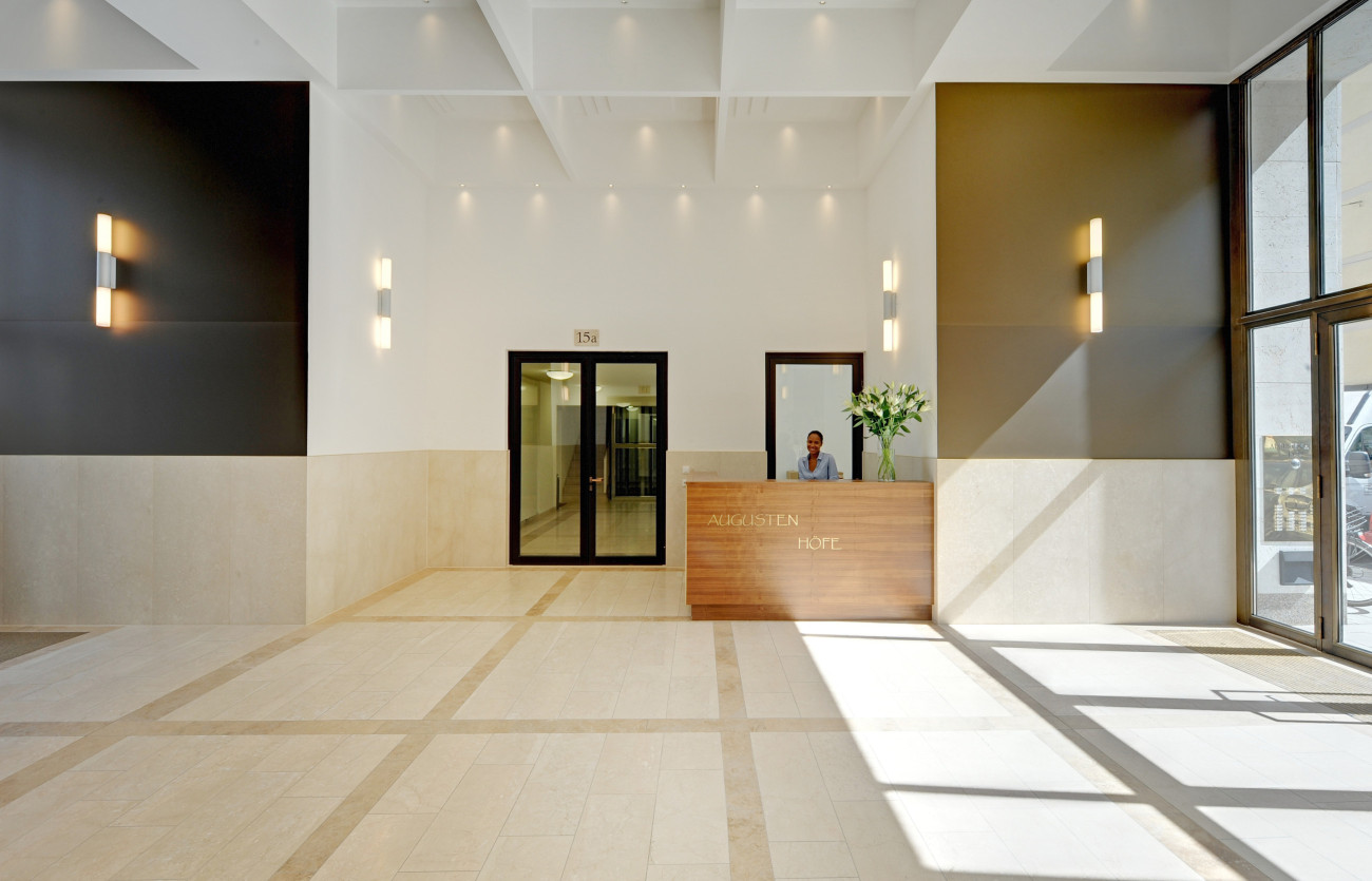 Großzügige und herrschaftlich ausgestatte Wohnungen für jeden Anspruch, exklusive Penthäuser mit spektakulären Panoramasichten auf die City, ein hauseigener japanischer Garten und ein Concierge sind kennzeichnend für die Augustenhöfe. In zwei Gehminuten ist man im Museumsquartier rund um den Königsplatz und in nur fünf Gehminuten in der Fußgängerzone und am Hauptbahnhof.
