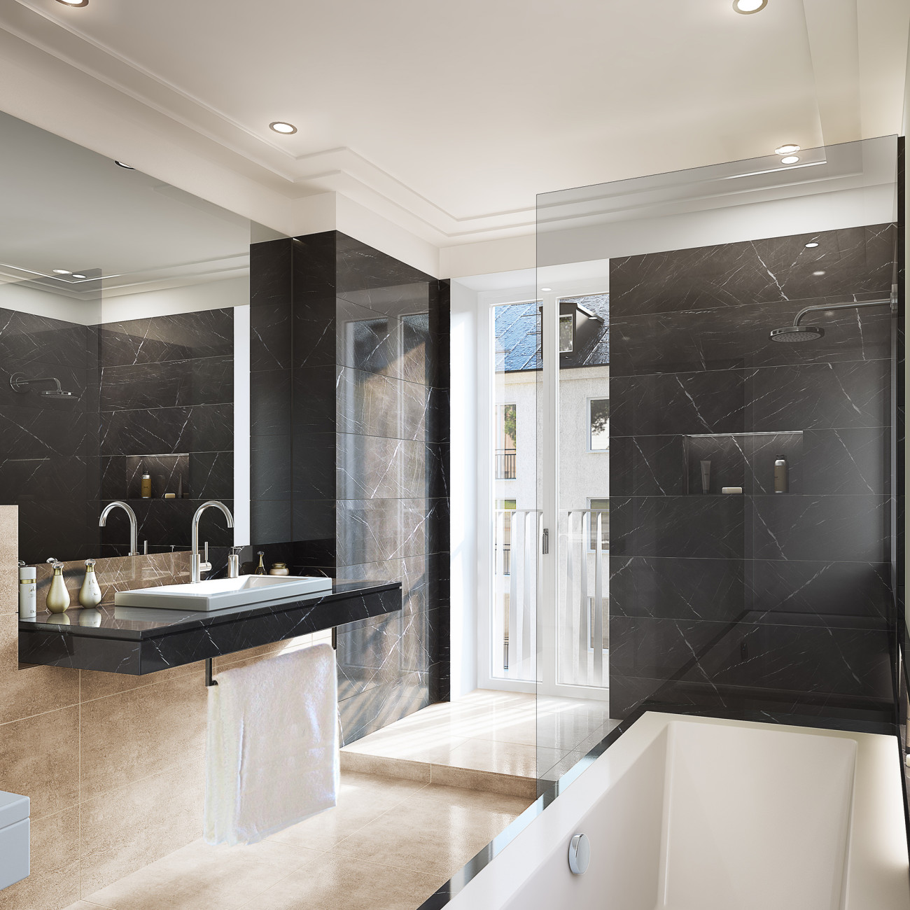 Bäder und Sanitärbereiche entsprechen dem hohen Design- und Qualitätsstandard. Großformatige Fliesen aus hellem italienischem Natur- oder Feinstein auf Böden und Wänden, teilweise ebenerdig ausgeführte Duschbereiche mit Glasabtrennungen, Handtuchheizkörper und Premiumprodukte namhafter Hersteller wie Villeroy & Boch, Duravit, Bette oder Dornbracht machen die Design-Bäder und Duschen zu wahren Wohlfühloasen.