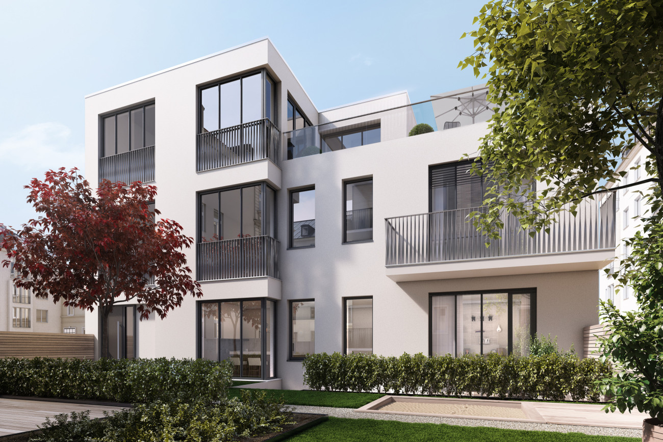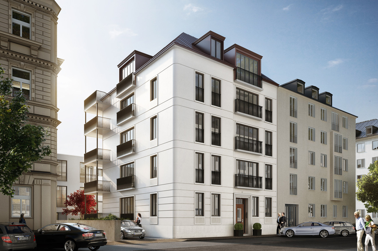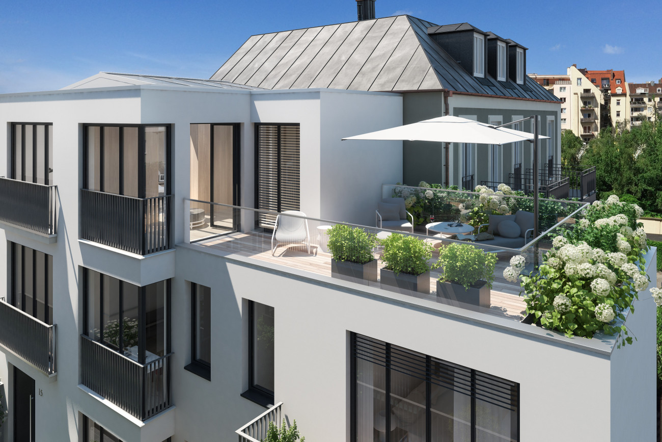 Highlights der Schwindstraße 15 sind die neu errichtete zweigeschossige Dachterrassen-Wohnung mit ca. 172 m² Wohnfläche und das eigenständige, dreigeschossige Stadthaus mit ca. 208 m² Wohnfläche.