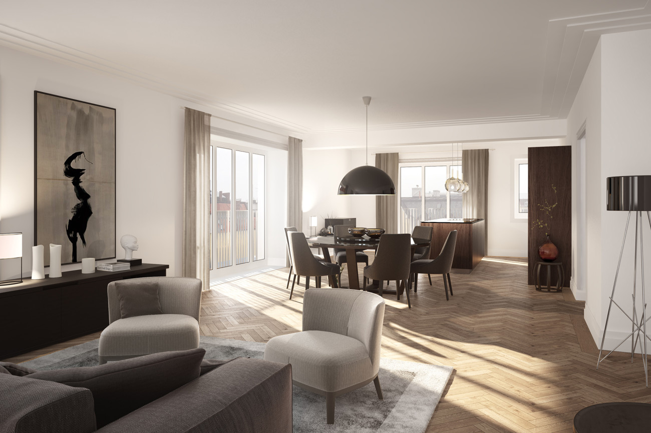Die Gebäudetechnik und der gesamte Innenausbau werden von Grund auf erneuert und mit Premiumcharakter an heutige moderne Anforderungen angepasst. Die Fassade wird neu und modern transformiert und erhält großzügige Glasfronten, Balkone sowie fast durchgehend bodentiefe Fenstertüren mit französischen Balkonen, um die Wohnräume attraktiv und lichtdurchflutet zu gestalten.